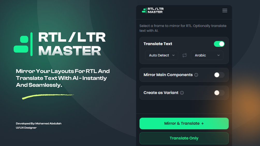 Stop wasting countless hours manually flipping layouts, reversing components, and translating text for Right-to-Left (RTL) languages. RTL Master is the ultimate, all-in-one Figma plugin that automates the entire LTR-to-RTL conversion process with precision and intelligence.